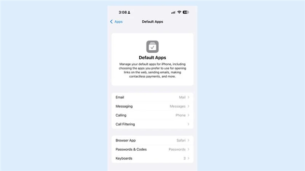 默认应用设置目前涵盖电子邮件、消息、电话、电话过滤、浏览器、密码和代码管理、键盘输入法等类别。