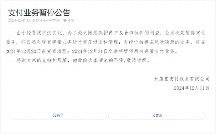 公告显示,开店宝支付从即日起对现有存量业务进行有序退出和清理:对经评估存在风险隐患的业务,将在2024年12月20日前完成清理;2024年12月31日之后将暂停所有存量支付业务。
