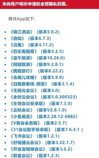 具体来说,在未向用户明示申请的全部隐私权限的App中,包括了《锦江酒店》《自如》《泊寓》《途牛旅游》《同程旅游》《携程旅行》《去哪儿攻略》《飞书会议》等20款。