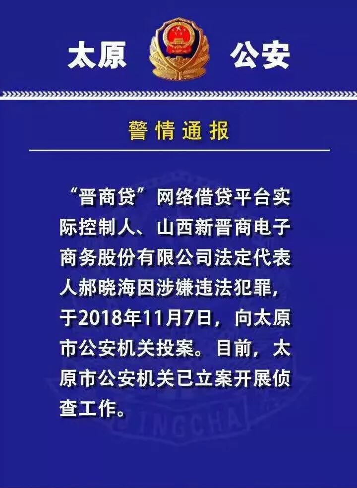11月8日,太原警方发布警情通报称,“晋商贷”网络借贷平台实际控制人、山西新晋商电子商务股份有限公司法定代表人郝晓海因涉嫌违法犯罪,于2018年11月7日,向太原市公安机关投案。